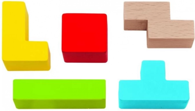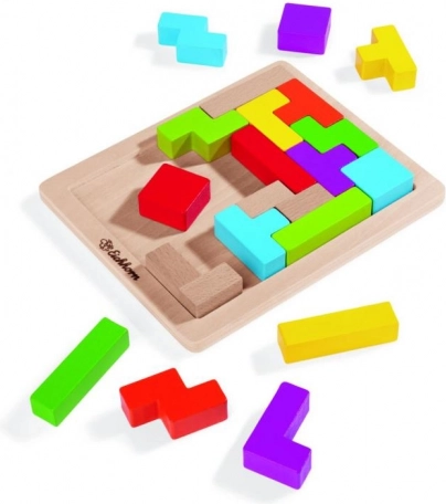 Ingénieux puzzle en bois pour 1 joueur, qui favorise le développement de la motricité fine et de la pensée logique. Contient 20 blocs colorés en bois de hêtre de 5 formes différentes et une planche solide en contreplaqué de 18 × 15 cm pour un assemblage précis des formes.