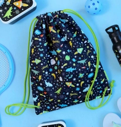 Sac de sport pour enfant léger et pratique avec motif espace de A Little Lovely Company, idéal pour l’école, les activités et les sorties. Grâce au cordon de serrage, il s’ouvre et se ferme facilement ; à l’intérieur, une poche zippée permet de ranger en sécurité les petits objets. Fabriqué en 100 % polyester résistant, dimensions 32 × 42 cm.