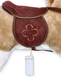 - Un module à piles est solidement dissimulé dans le ventre. Après insertion de 2× AA (non incluses), le cheval émet des sons :