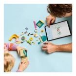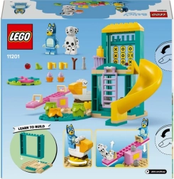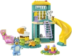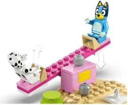 Ce set ludique sur le thème de l’aire de jeux offre aux enfants dès 4 ans de nombreuses possibilités de jeu libre et de construction. Deux figurines – Bluey et Flíček – peuvent dévaler la glissade jaune, se balancer, s’amuser sur la balançoire à bascule, grimper à l’échelle et observer les environs depuis la tour avec un télescope. On trouve aussi une plateforme ronde avec éléments de jeu, un mini-pique-nique avec tasses et cupcakes et de petites plantes à enjamber.