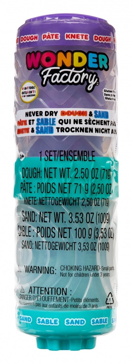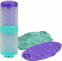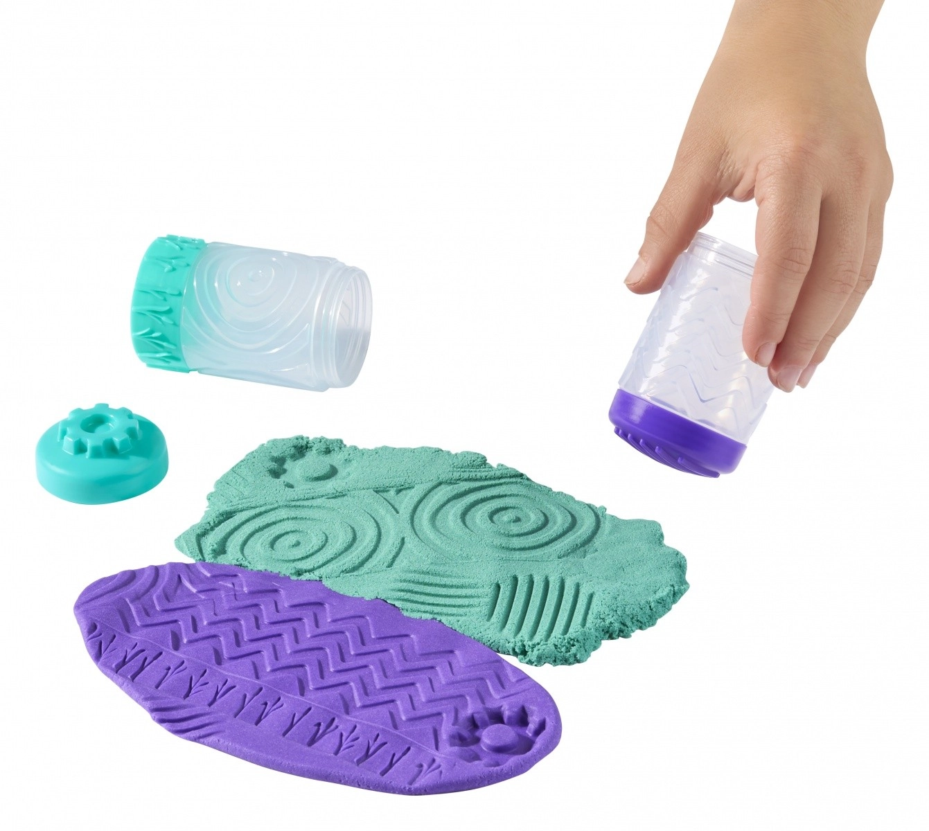 Jouez avec des consistances différentes – pâte souple et malléable et sable texturé – ou mélangez-les pour créer une texture totalement nouvelle. Grâce à l’emballage durable, chaque élément fait aussi partie du jeu : les capuchons tamponnent, le connecteur roule et les tubes transparents stockent le contenu en toute sécurité.
