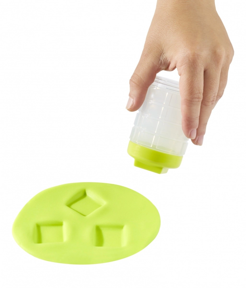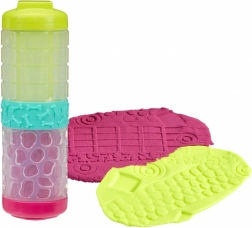 Le set comprend un outil multifonction 4 en 1 avec embouts interchangeables pour rouler et imprimer des motifs. Un emballage durable et ingénieux fait partie intégrante du jeu : les couvercles servent de tampons et le connecteur fait office de rouleau texturé. Il est possible de combiner la pâte avec le sable afin de créer un nouveau mélange à l’haptique unique, stimulant le sens sensoriel et la créativité.