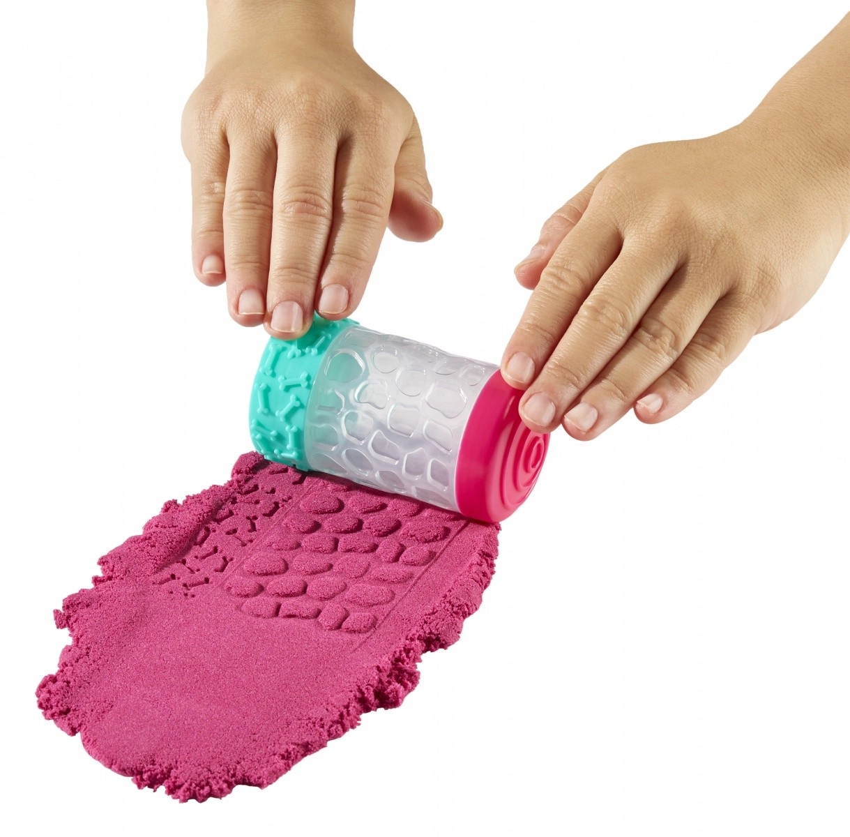Créer des surfaces texturées devient un jeu d’enfant : le rouleau et les tampons laissent des empreintes nettes dans le sable comme dans la pâte.