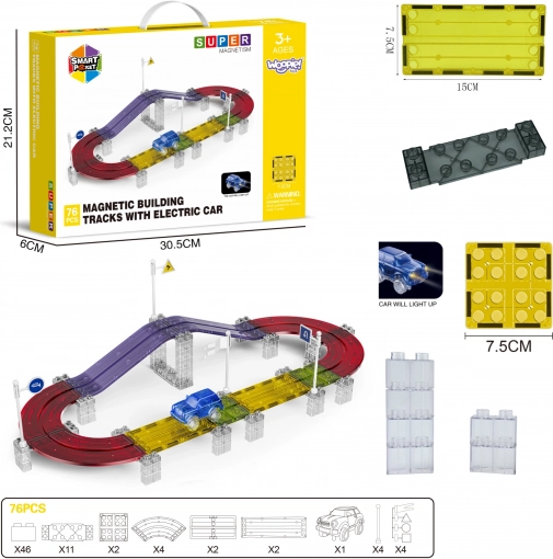 Piste de course magnétique WOOPIE avec petite voiture, 76 pièces