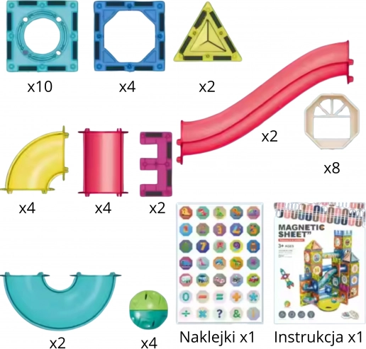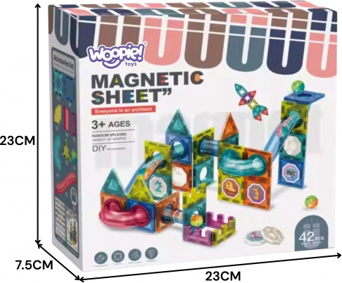 L’ensemble comprend 42 composants, dont des tuiles magnétiques et des sections de piste profilées, permettant de créer des constructions variées, stables et ludiques. Les pièces s’assemblent facilement et solidement grâce à des aimants performants, pour réussir même des projets plus audacieux.
