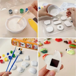 Le kit est conçu pour les enfants à partir de 6 ans et contient tout le nécessaire : moules, plâtre, peintures, pinceau et outils pour mélanger. Aucun four ni outil spécial n’est requis – un peu d’eau et un espace de création suffisent.