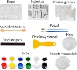 - Tout inclus : moules, plâtre, bol, cuillère, palette, 6 peintures, pinceau, spatule, notice