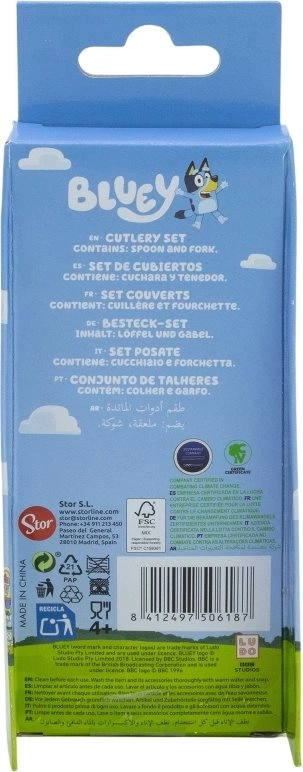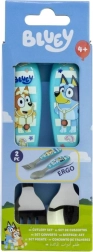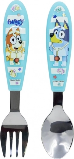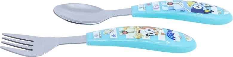 Adorable ensemble de couverts pour enfants avec motif BLUEY, comprenant une cuillère et une fourchette en acier inoxydable de qualité. Grâce aux formes arrondies, l’utilisation est sûre et confortable pour les petites mains, et le décor sur les manches motive les enfants à manger de manière autonome. Sans BPA.