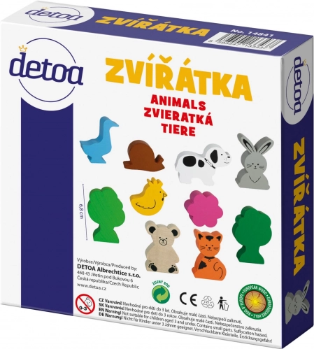 Set de 10 animaux en bois dans une boîte 15×15×4 cm. Figurines naturelles et colorées pour stimuler l’imagination et la motricité. Compatible avec les produits DETOA.