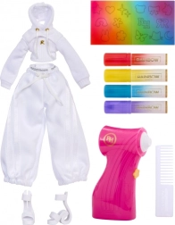 Cette poupée créative est comme une toile blanche – entièrement vêtue de blanc, avec des cheveux blancs et une tenue prête pour votre imagination. La boîte contient quatre feutres arc‑en‑ciel lavables (rouge, jaune, bleu, violet) et un aérographe pratique pour un ombrage facile et une application homogène de la couleur.