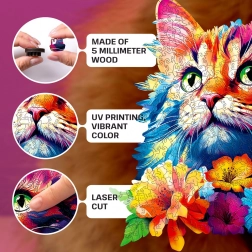 Ce puzzle en bois premium sur le thème du chat allie un savoir‑faire de qualité à une approche écoresponsable. Grâce au bois de 5 mm, il est stable et agréable au toucher, la découpe laser garantit des bords lisses et un ajustement parfait des pièces. L’impression UV moderne offre des couleurs intenses et une image détaillée qui se démarque également comme décoration murale.