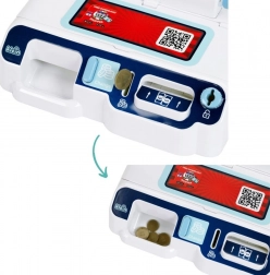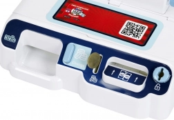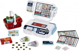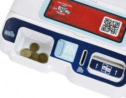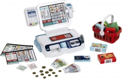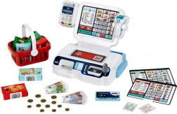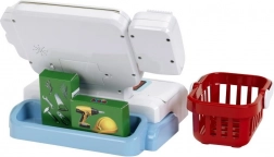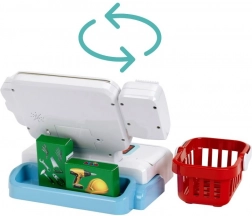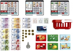 Sont inclus un panier de courses, des billets et pièces, une carte de paiement et des cartes de produits, afin que les enfants puissent scanner les articles, les enregistrer à la caisse et « payer » en espèces ou par carte. Trois écrans interchangeables modifient le poste de jeu selon l’humeur – magasin, bistrot ou caisse classique.