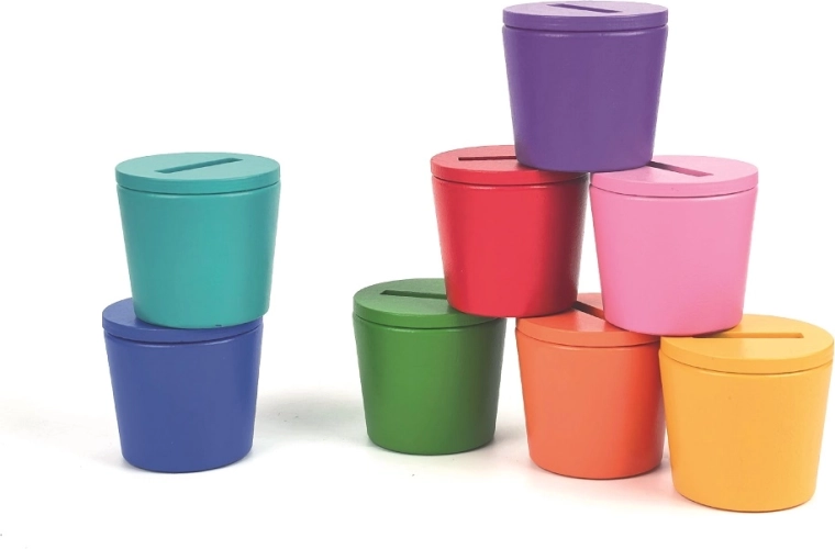 • Gobelets avec couvercles et fentes pour insérer des « pièces »