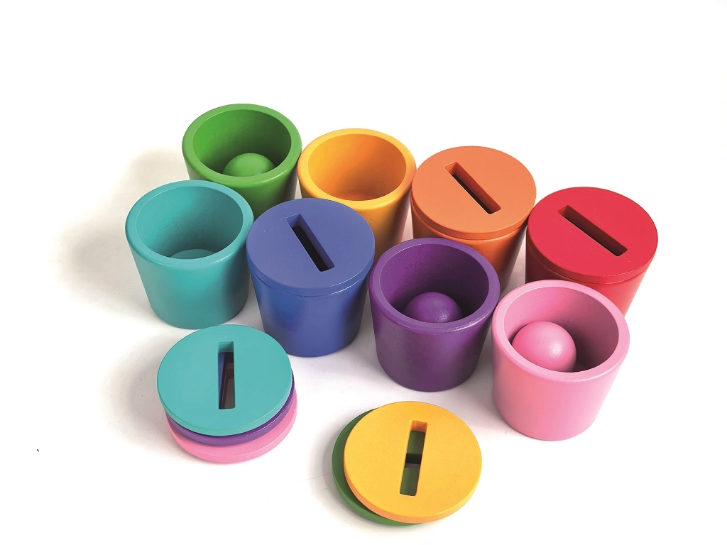 Des gobelets colorés avec couvercles et fentes permettent d’insérer les disques, ce qui favorise la concentration, la patience et la planification motrice.