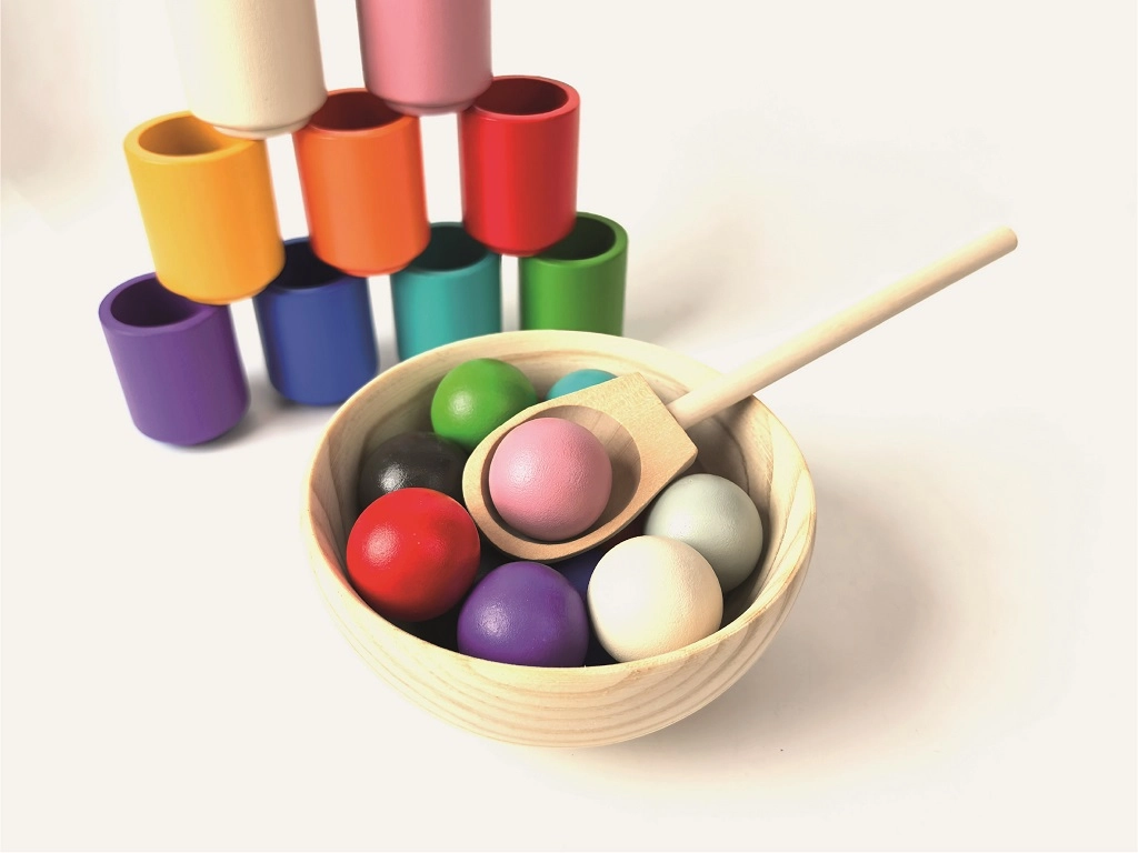 Découvrez un ensemble Montessori créatif pour trier les couleurs, qui développe la motricité fine, la coordination œil–main et la perception des couleurs. Les enfants transfèrent les billes en bois dans les coupelles de couleur correspondante à l’aide d’une cuillère, apprenant ainsi la patience et la concentration. Fabriqué en bois 100 % certifié FSC avec une surface lisse et agréable et des couleurs vives.