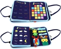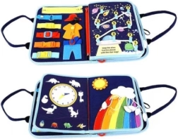 À l’intérieur, vous trouverez des activités comme des boutons, boucles, fermetures éclair, scratchs et lacets, qui aident à l’acquisition de compétences pratiques et d’autonomie. Grâce à sa conception souple, le livre est sûr, léger et adapté aux voyages.