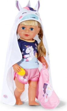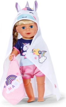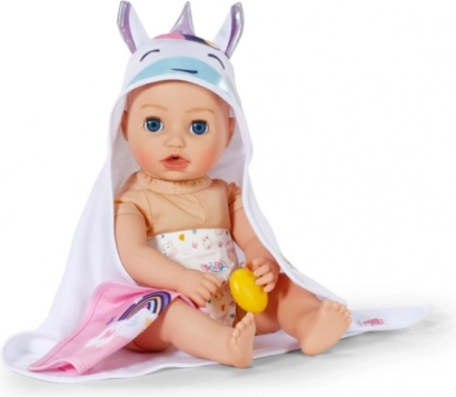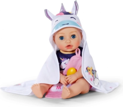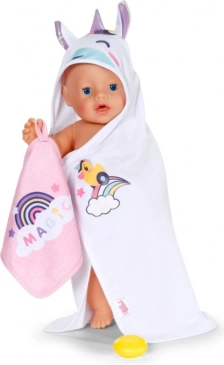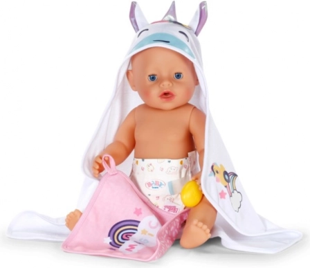 Offrez à votre poupée un confort maximal après le bain avec ce joli set de serviettes BABY born. Il comprend deux pièces toutes douces avec motif licorne et arc‑en‑ciel, une capuche imprimée avec de petites oreilles. Idéal pour les poupées de 36 cm et 43 cm. Matière douce, motif licorne magique et capuche pratique pour un séchage et un jeu stylés.