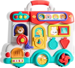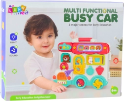 La voiture interactive « Busy Car » combine un panneau éducatif, un trieur de formes, un petit piano et des éléments mobiles qui incitent les enfants à explorer le monde des couleurs, des formes, des lumières et des sons. Les enfants peuvent appuyer sur des boutons lumineux, ouvrir des petites portes, faire tourner des roues, faire coulisser des éléments et ainsi développer la coordination œil-main, la motricité fine et l’imagination.