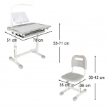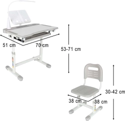 - Structure évolutive : réglage de la hauteur du bureau (53–71 cm) et de l’assise de la chaise (30–42 cm)