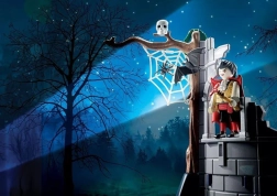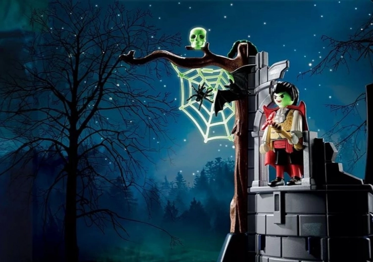 Le set promotionnel PLAYMOBIL comprend des ruines de château soigneusement conçues, 3 figurines, un coffre/tombe, plusieurs araignées, des chauves-souris et d’autres éléments effrayants qui ajoutent tension et amusement au jeu.