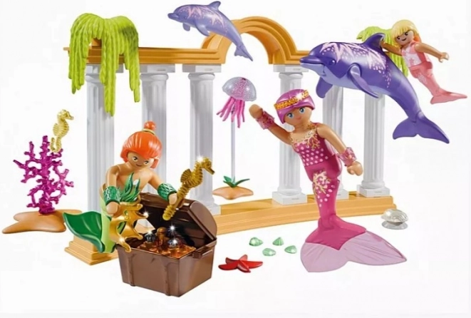 Découvrez le monde sous-marin enchanté avec une famille de sirènes en quête d’un trésor mystérieux d’une cité engloutie. Inclus: un dauphin joueur avec son petit et un coffre débordant d’or, de pierres précieuses et d’accessoires – dont une véritable bague. Le set offre de riches détails tels que des récifs coralliens, des plantes marines et de jolies créatures, idéal pour le jeu créatif.