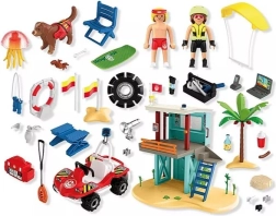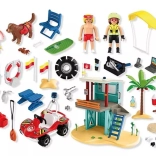 - tour de sauvetage (2 niveaux), buggy de plage, sauveteur, chien sauveteur, kitesurfeur, méduse, crabe, planche de sauvetage, outils, accessoires