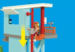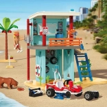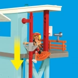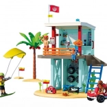 Ce set détaillé comprend une tour de sauvetage à deux niveaux avec barre de descente rapide, un poste de sauveteur entièrement équipé et un coin atelier avec outils au rez-de-chaussée. Un buggy de plage permet d’intervenir loin de la tour, avec une planche de sauvetage et un fidèle chien sauveteur avec gilet.