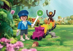 - Locomotive, 3 wagonnets, figurine de chef de train, 4 animaux (singe, guépard, souris, hérisson), accessoires (signal)