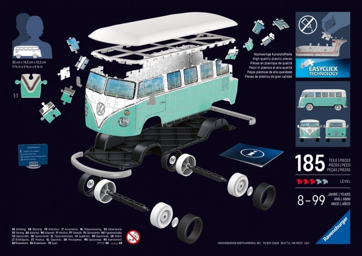 Assemblez un véhicule iconique avec le puzzle 3D de RAVENSBURGER – le VW T1 Bulli stylé. Les pièces en plastique rigide s’emboîtent avec précision sans colle, le modèle terminé tient donc fermement. Profitez de détails réalistes, d’une fabrication durable et d’un entretien facile – un simple chiffon humide suffit. Idéal comme cadeau pour les fans d’automobile et les constructeurs créatifs dès 8 ans.