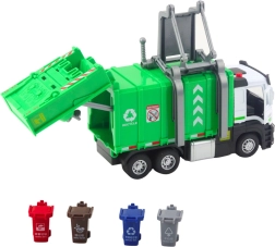 Le modèle dispose d’une trappe arrière ouvrante et d’un mécanisme de levage des conteneurs, permettant de charger et décharger les déchets de façon réaliste. Quatre bacs colorés incitent les enfants au tri des déchets et les sensibilisent à la protection de l’environnement. La structure solide en plastique complétée par des pièces métalliques résiste même aux jeux intensifs.
