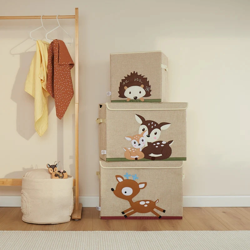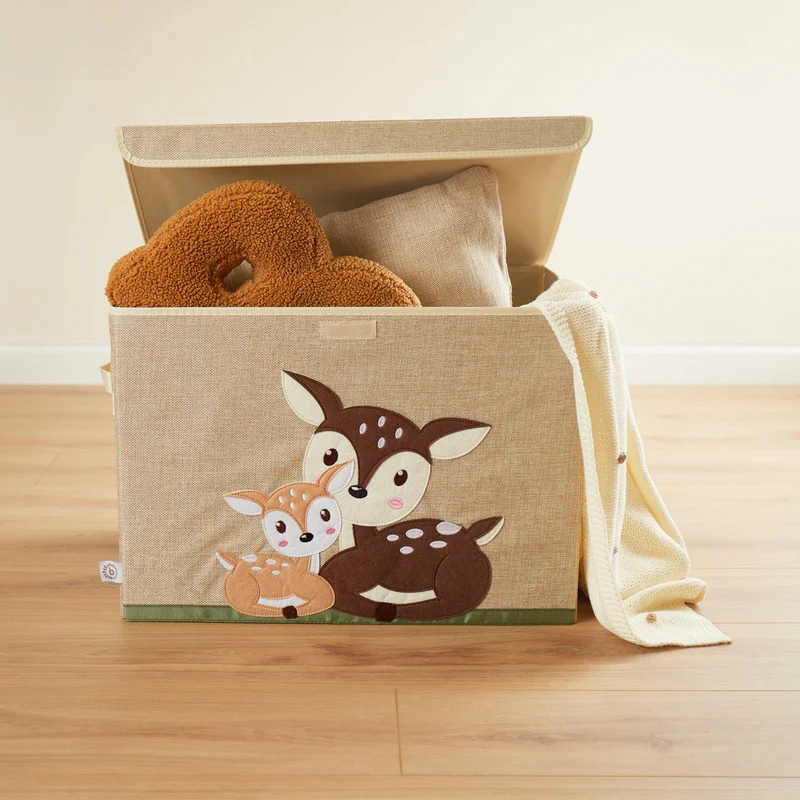 Le design adorable à motif de faons rend toute chambre d’enfant plus cosy tout en offrant un espace de rangement pratique. La boîte est stable mais légère, ce qui permet aux enfants comme aux parents de la transporter aisément. La construction pliable fait gagner de la place et le couvercle à velcro garde le contenu bien caché.