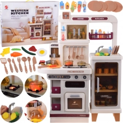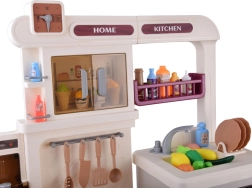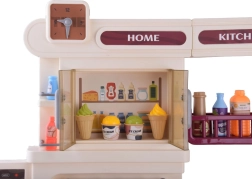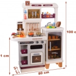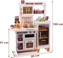 Cette cuisine interactive spacieuse permet aux enfants d’imiter la cuisson, la pâtisserie et la vaisselle. Grâce au brûleur avec effet de vapeur avec lumière et son de cuisson, au four ouvrant, aux étagères et crochets pour les ustensiles et au distributeur d’eau, le jeu paraît extrêmement réaliste et amusant.