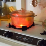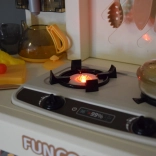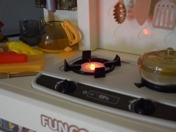 Le brûleur interactif propose deux modes : bruit de cuisson avec lumière ou effet de vapeur avec son. Les boutons rotatifs et le panneau ajoutent une touche réaliste au jeu.