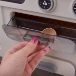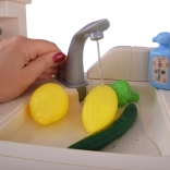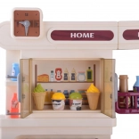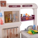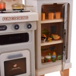 Les portes ouvrantes du four et des armoires de rangement, ainsi que le réfrigérateur avec aliments, invitent les enfants à servir, cuire et organiser les provisions.