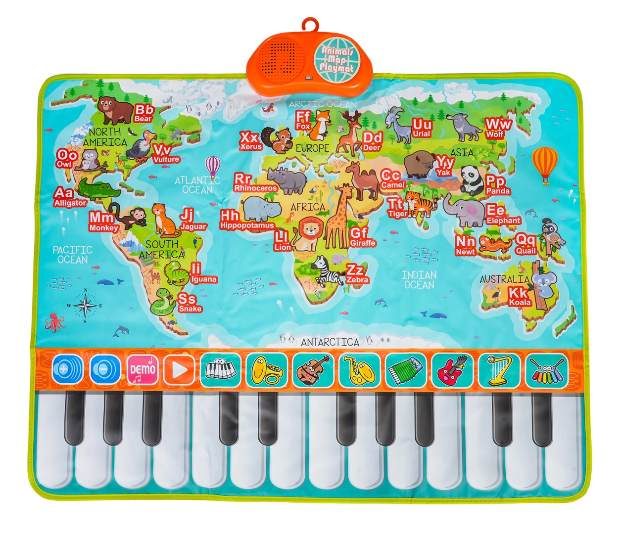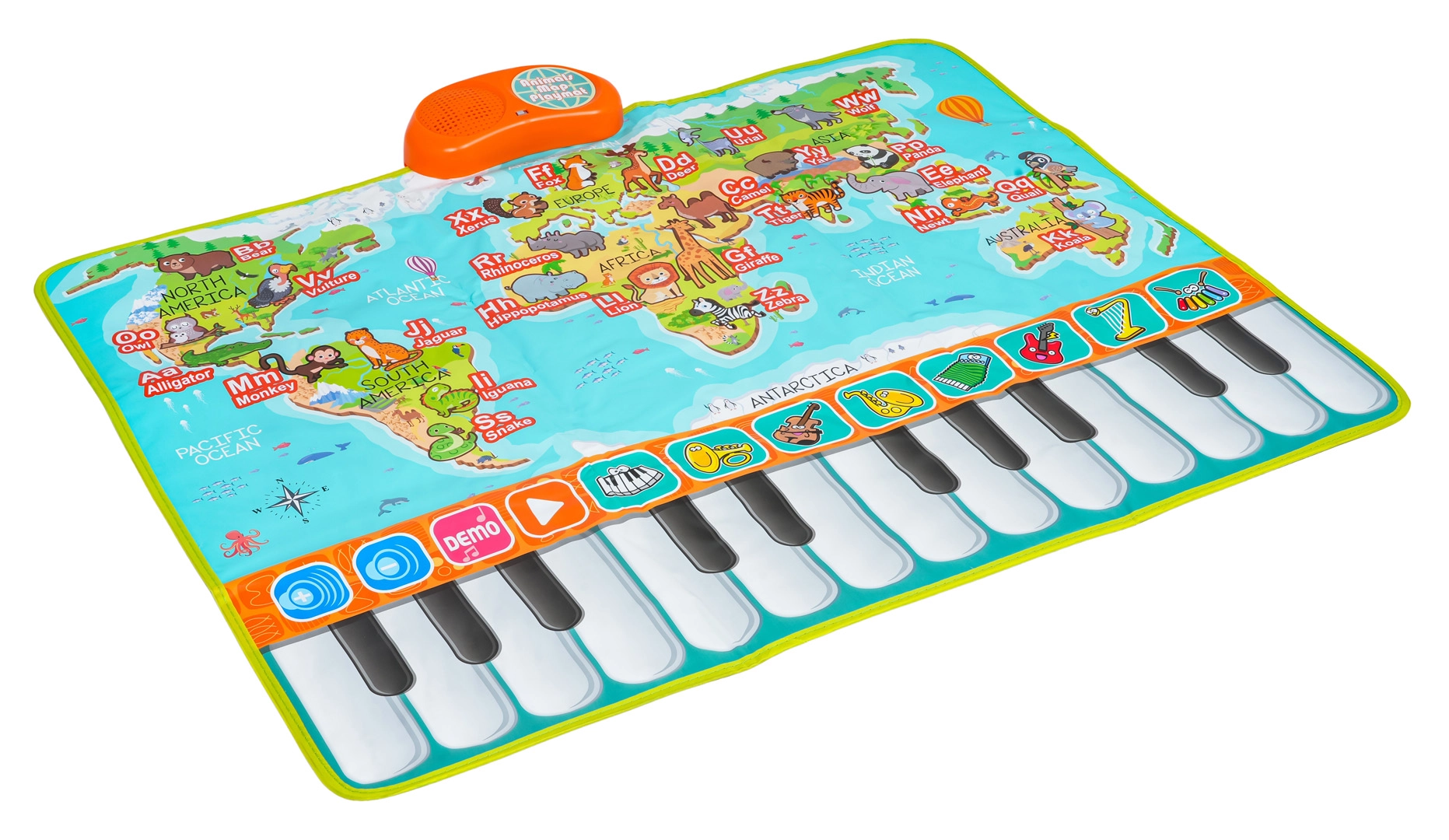 Découvrez le monde de la musique et des animaux avec ce tapis coloré qui apprend aux enfants, de façon ludique, les lettres, les noms des animaux en anglais et développe la motricité fine ainsi que l’ouïe. Le panneau de contrôle avec haut-parleur et interrupteur On/Off complète le piano tactile à 24 touches et ses modes pour apprendre et s’amuser.