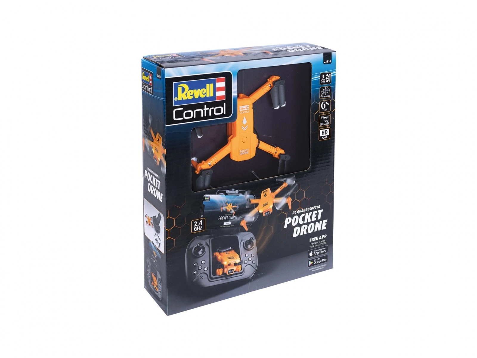 Le mini drone de poche REVELL Control apporte un maximum de fun dans un format réduit. Avec une longueur de 110 mm, une largeur de 134 mm et une hauteur de 35 mm, il se range aisément dans le compartiment de la radiocommande et est toujours prêt à décoller. La caméra intégrée 720p transmet des photos et des vidéos basiques en direct sur votre smartphone pour découvrir le monde sous un nouvel angle.