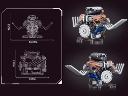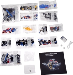 Le kit comprend des sachets numérotés pour une organisation facile, un câble USB pour la charge et un manuel illustré clair. Une lumière rouge spectaculaire donne au modèle un aspect saisissant et met en valeur les pièces en mouvement.