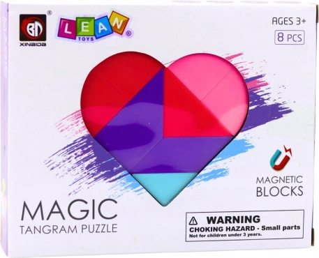 Découvrez le plaisir du tangram magnétique – cœur. Huit pièces colorées dotées d’aimants de qualité permettent d’assembler des dizaines de figures et de motifs différents. Grâce à la fixation solide, les modèles sont stables, faciles à transporter et les enfants peuvent jouer longtemps avec joie.