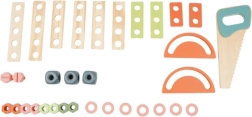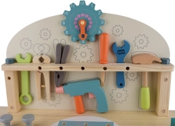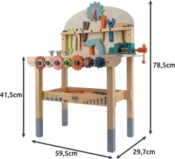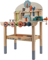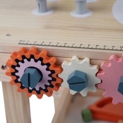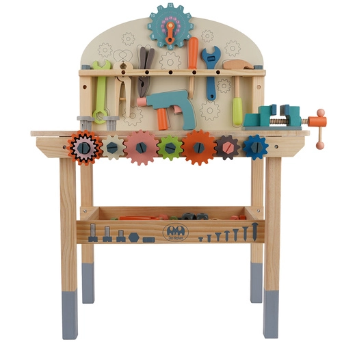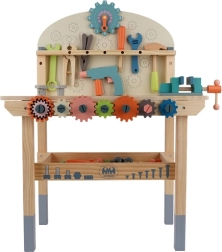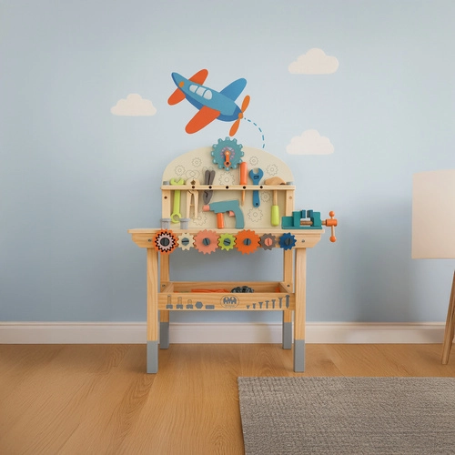 Un riche ensemble d’outils et d’éléments de fixation développe la motricité fine, la coordination œil-main et la pensée logique. L’étagère inférieure pratique offre de l’espace pour ranger les pièces et accessoires. Un cadeau idéal qui ravira tous les petits bricoleurs.