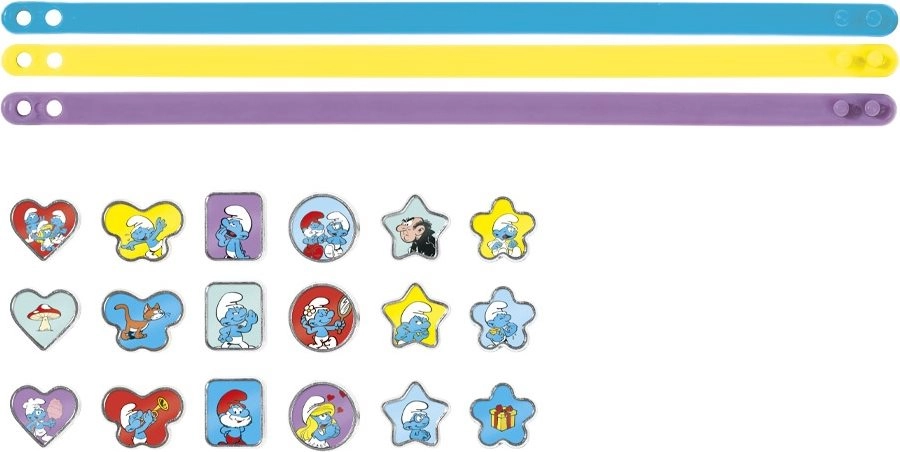 - 3 bracelets (jaune, violet, bleu), 18 perles à motifs des Schtroumpfs