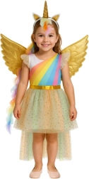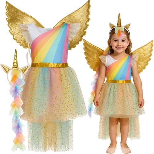 Adorable déguisement de licorne pour enfant en taille 122–128 cm, qui transforme chaque petite princesse en créature magique. Le set comprend une jupe avec un voile de tulle scintillant, des ailes dorées et un serre-tête avec corne. Le costume est léger et confortable à enfiler par la tête, idéal pour le carnaval, Halloween, les fêtes et les spectacles scolaires, et peut être lavé en machine à 30 °C. La certification selon les normes européennes garantit une utilisation sûre.