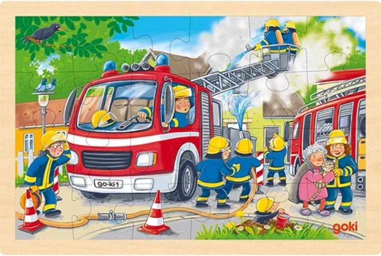 Découvrez un puzzle en bois de qualité sur le thème d’une intervention des pompiers de la marque GOKI. Le puzzle de 24 pièces est placé sur une plaque en bois avec bord fraisé pour un assemblage plus facile. De plus, une image supplémentaire se cache sous les pièces, ce qui surprend et motive les enfants. L’assemblage développe la motricité fine, la concentration et l’imagination.