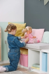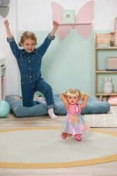 Grâce à son excellente mobilité, elle bouge les bras, tourne la tête et possède des genoux articulés, ce qui permet de l’asseoir et de la mettre debout facilement. Son corps rigide autorise aussi les jeux dans l’eau, pour que Carla profite des rituels du bain. Sa tenue colorée avec jupe en tulle arc-en-ciel et petites chaussures roses souligne son style ludique.
