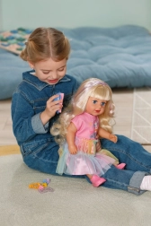 La poupée BABY born Carla offre aux enfants de nombreuses possibilités de jeu créatif. Ses longs cheveux en nylon, doux et soyeux, sont parfaits pour être brossés, attachés en queue-de-cheval ou tressés. Le set de 7 accessoires – brosse, élastiques et barrettes – stimule l’imagination pour un stylisme quotidien.