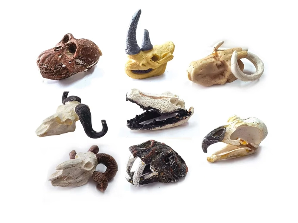 Chaque bloc renferme un modèle de crâne différent, par ex. mammouth, tigre à dents de sabre, crocodile, aigle, rhinocéros, buffle, mouton ou primate. Idéal pour collectionner et apprendre.