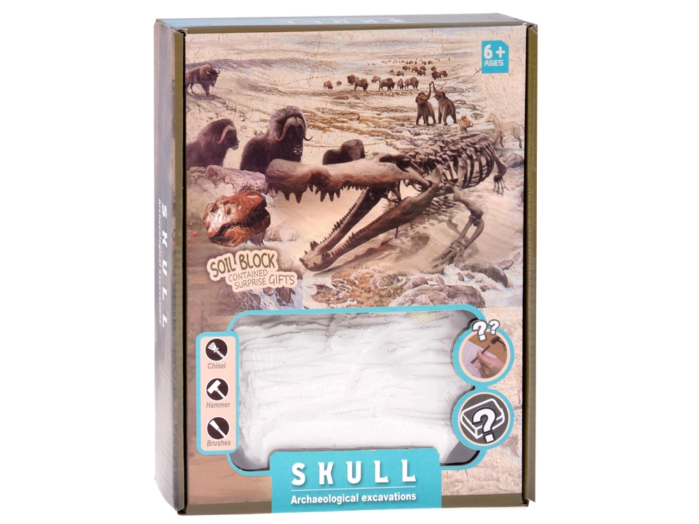 Devenez un petit archéologue et découvrez ce qui se cache à l’intérieur du bloc de plâtre ! Ce kit ludique et éducatif contient tout le nécessaire pour des fouilles en toute sécurité – burins, petit marteau, pinceau et lunettes de protection. À l’intérieur vous attend un fossile de crâne aléatoire d’animaux et de créatures préhistoriques. Des outils réalistes, un bloc de plâtre souple et un divertissement éducatif qui favorisent patience, concentration et motricité fine.