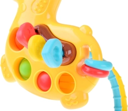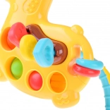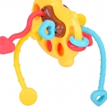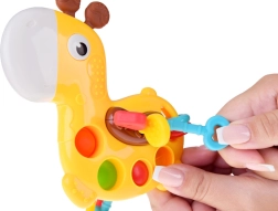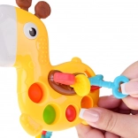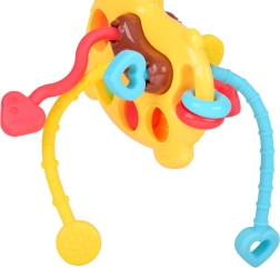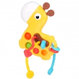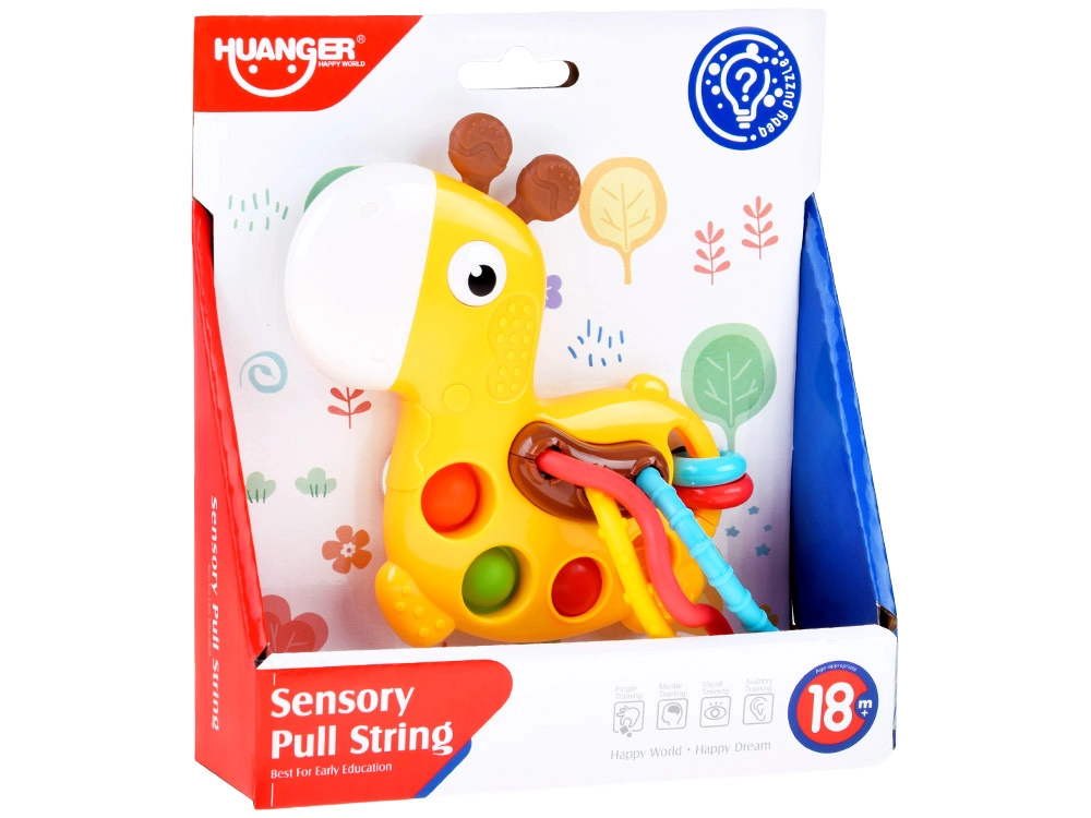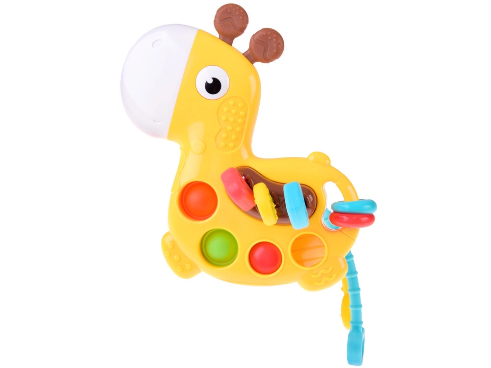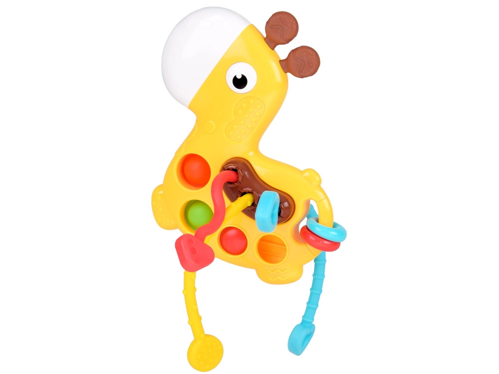 La mini girafe offre une stimulation sensorielle riche : l’enfant peut appuyer sur les bulles pop it, faire glisser les perles ou tirer sur les excroissances souples à travers le corps de la girafe. Le matériau doux et sûr masse délicatement les gencives et aide pendant la poussée dentaire, tandis que les effets colorés et sonores favorisent la concentration et la curiosité.