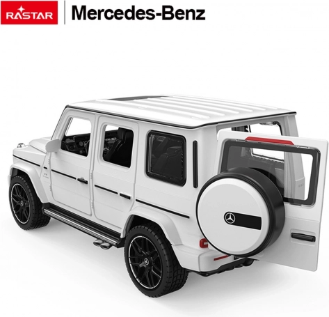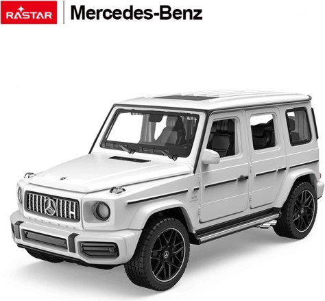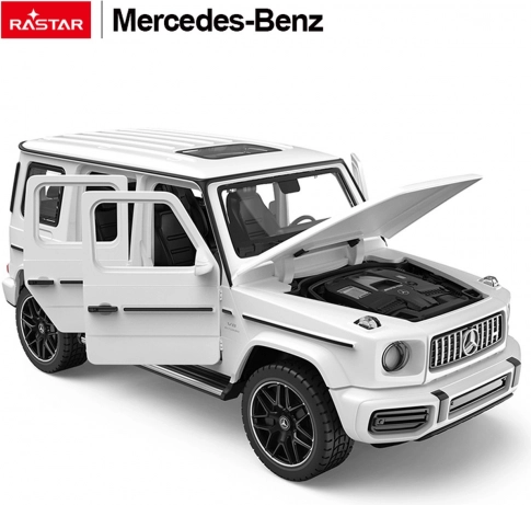 Modèle métallique détaillé à l’échelle 1:32 représentant l’iconique MERCEDES‑BENZ AMG G63 de la marque Rastar. Il offre une carrosserie en métal, des roues en caoutchouc, des phares et sons fonctionnels ainsi qu’un capot et des portes latérales ouvrants. Alimentation LR44 incluse et certifications CE/EN71/RoHS.