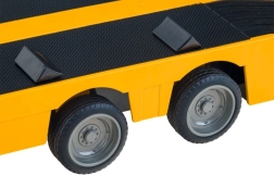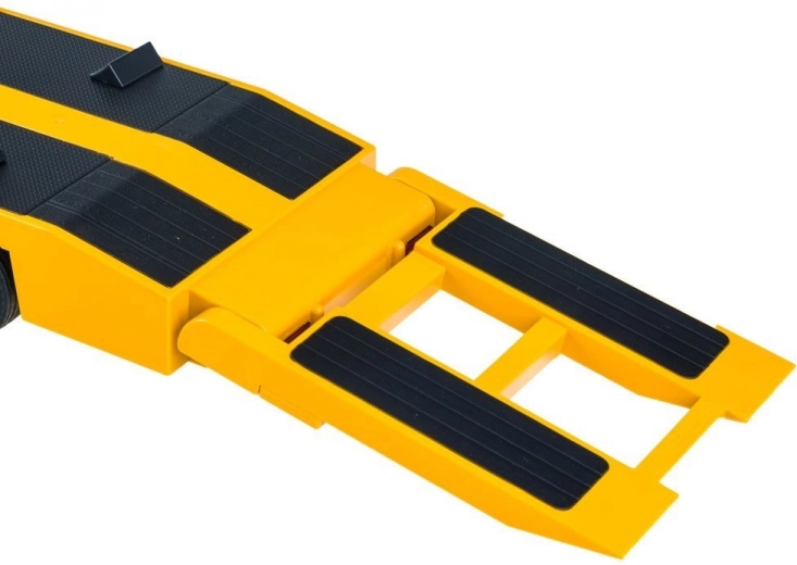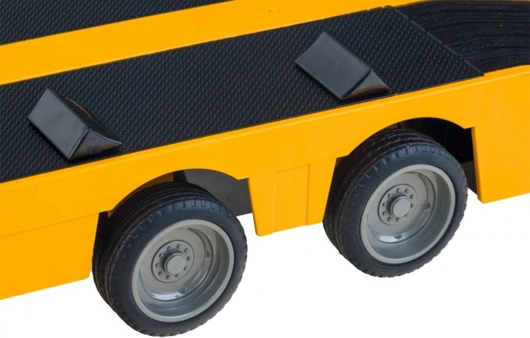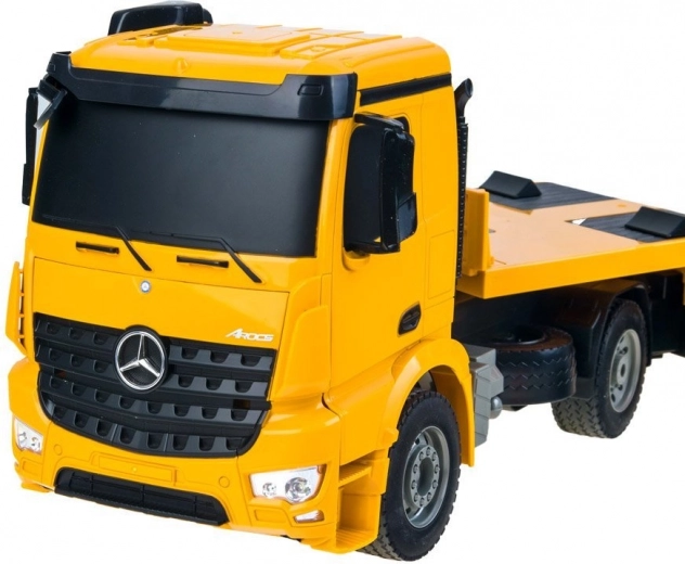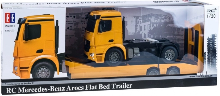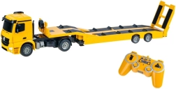 Tracteur MERCEDES-BENZ sous licence avec semi-remorque plateau pour le transport d’engins de chantier, offrant sons de moteur réalistes, effets lumineux et contrôle complet en 2,4 GHz. Grâce aux pneus en caoutchouc et au réglage du parallélisme des roues, la conduite est fluide et précise. La semi-remorque dispose d’une rampe relevable et de béquilles réglables, et peut être raccordée/déconnectée électroniquement via la télécommande.