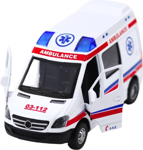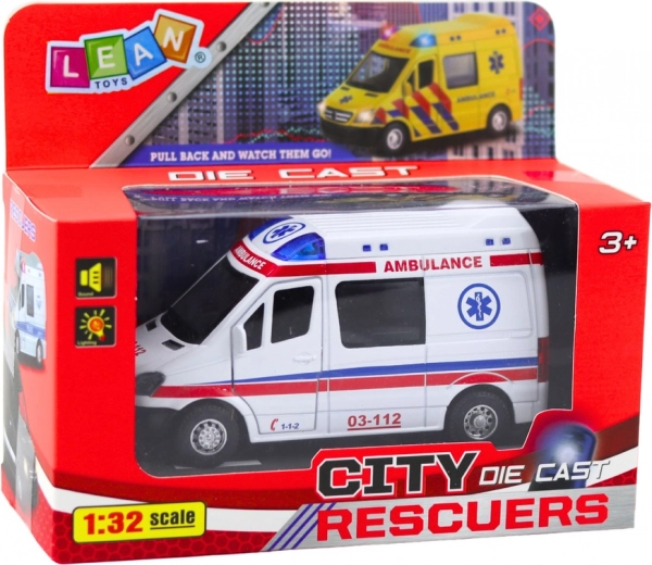 - ambulance 1:32 à propulsion pull-back, 3× piles AG13, emballage du fabricant